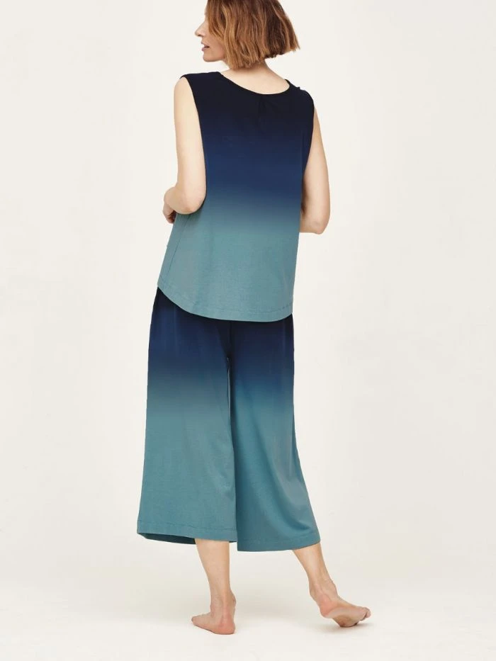 The fabric is soft and breathable, these pyjamas will get softer with wear and washing – one of the brilliant properties of bamboo jersey. The top of this set is a relaxed fitting vest and an open neckline, the bottoms are a wide culotte fit.
