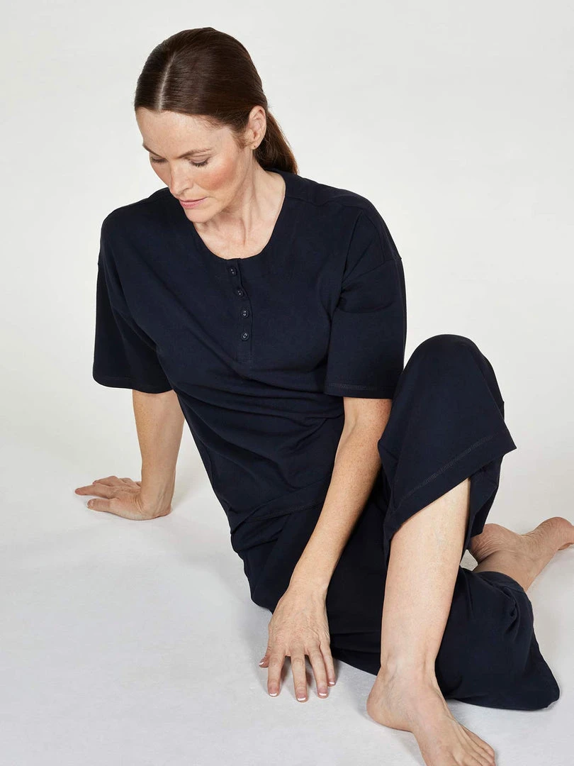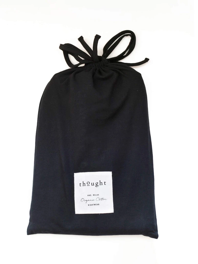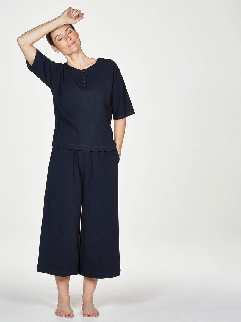 Introducing Thought’s new at home and lounge essential set. The Lettice pyjama set is the ultimate in comfort but also definitely more than OK to be seen out of the house in! We love the oversized top with dropped shoulders and button detail. The trousers are a 7/8 wide leg culotte shape with a fully elasticated shape. Wear together or each piece individually looks great matched with another one of our lounge and pyjama pieces. The bag which this set is sold in is also great as a travel laundry bag.