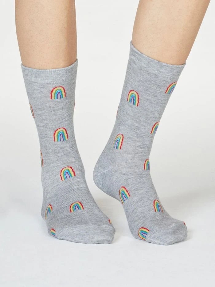 - A pair of Thought signature patterned socks crafted from GOTS organic cotton blend yarn in a fun rainbow design