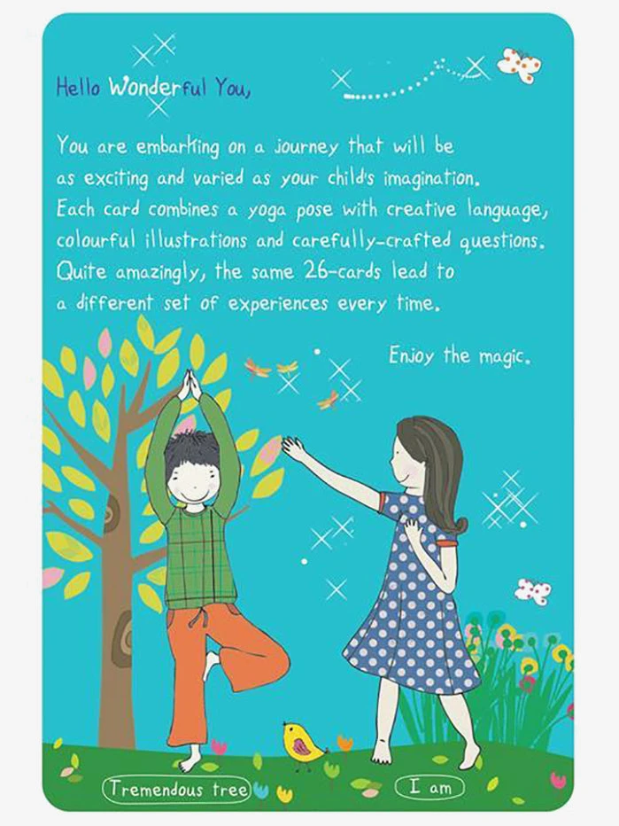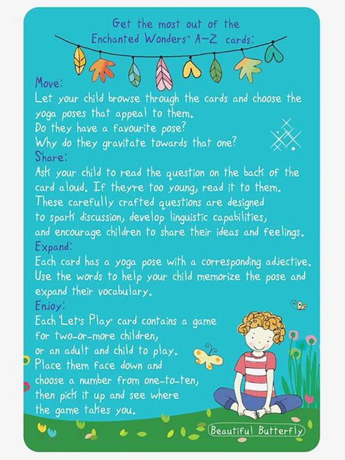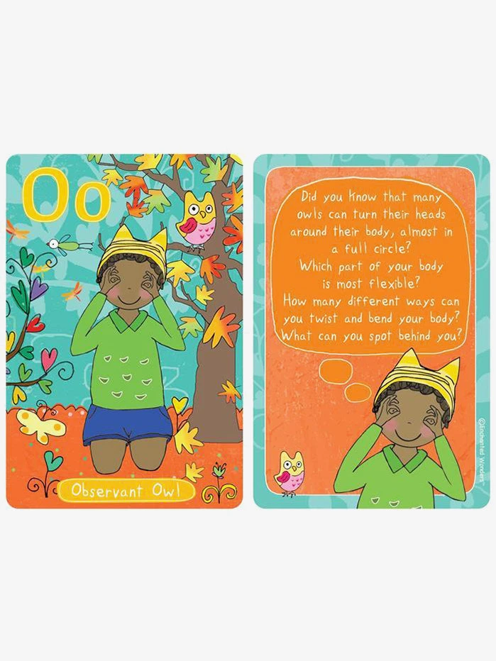 Each unique card combines a yoga pose presented with a unique colourful illustration complemented with carefully crafted questions and some charming text. Whether it’s playing memory games, creating yoga dances or building stories around each card, your child is bound to love diving into this colourful world of self-expression. This colourful batch of A-Z cards will lead your child through a journey of endless learning, where they are guaranteed to have a different experience each time.