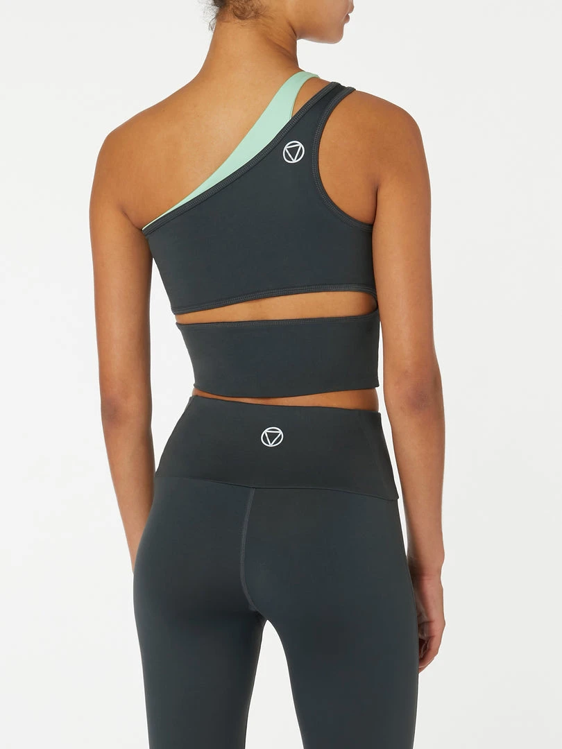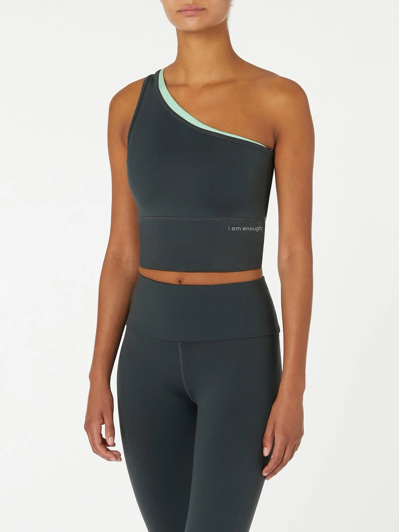 Both practical and stylish, meet your new favourite sports bra from Frost Body. Featuring flattering one shoulder design with contrast mint colour inner support layer and reflective ‘i am enough’ affirmation graphic. Logo and cut out design in the back.