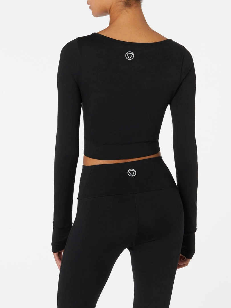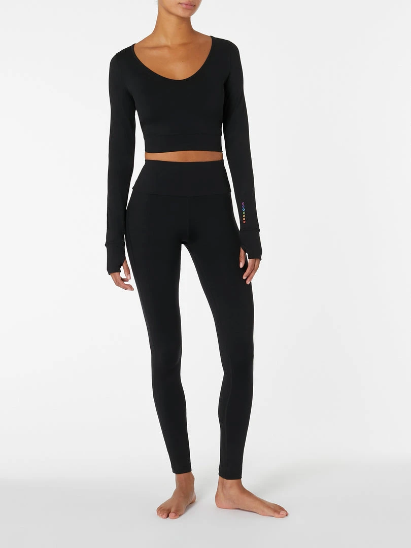 This top features a tight supportive fit and cropped length with long sleeves. Unique FROST Chakra graphic on wrist and round scoop neckline.