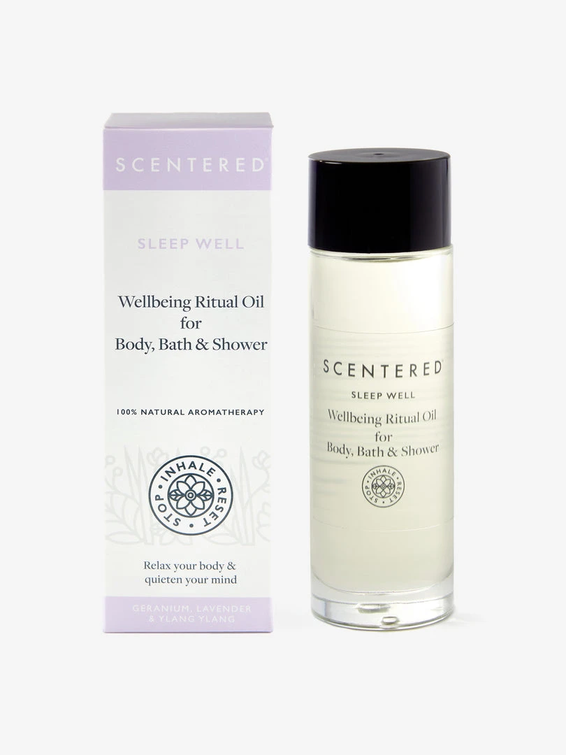 Rich in fatty acids and vitamin E the natural base oils of Safflower, Jojoba and Apricot kernel work to replenish moisture, elasticity, and suppleness to the skin whilst the special Scentered blend of essential oils including Geranium, Lavender and Ylang Ylang relax and calm an active mind, overworked senses and tired body to prepare you for a blissful restorative sleep.