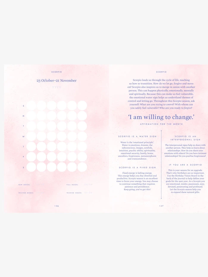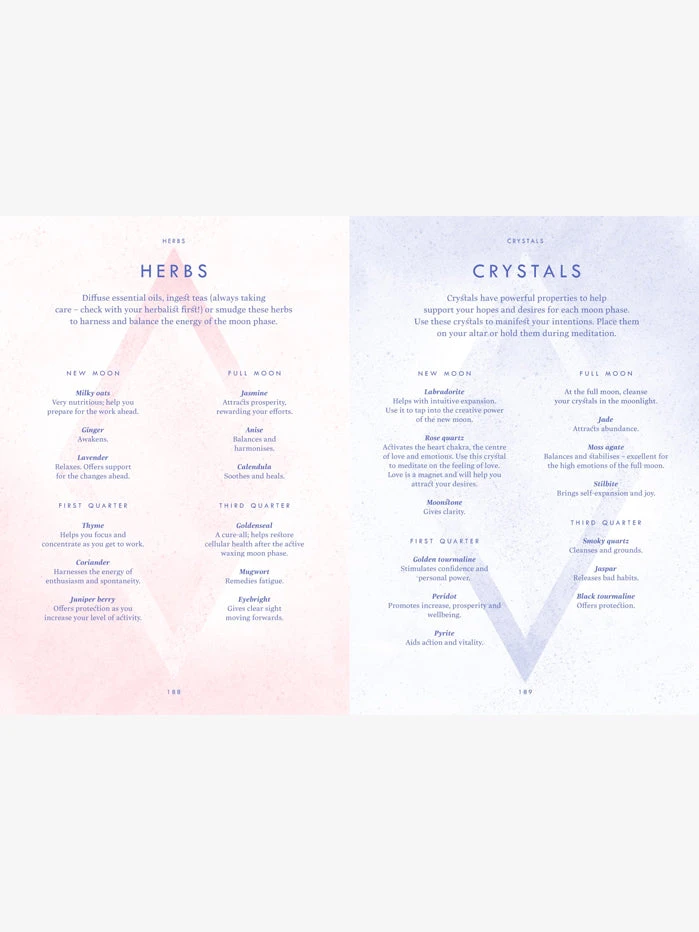This Moon Journal is a beautiful hardback, complete with a pearlescent foil finish and ribbon marker, offering daily, weekly and monthly astrological guidance, affirmations, rituals and journal excercises alongside space to record your journey of self-discovery.