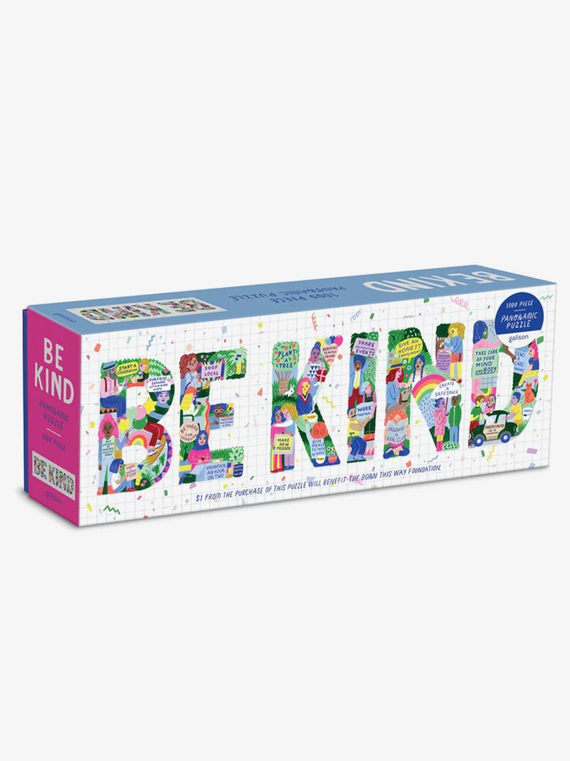 The Be Kind Panoramic puzzle is a collaboration with the Born This Way Foundation that focuses on the very important message of being kind! Included in the box is a 21 Days of Kindness Fill-In Calendar that you can fill in with your own kindness prompts.