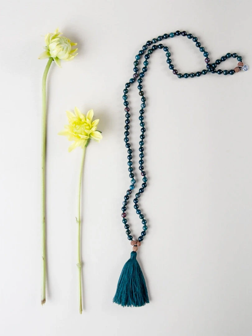 Rudraksha seeds grow inside of what look like blueberries on trees South East Asia. In Buddhism and Hinduism, the beads are believed to provide inner calm, peace, and free one from negative thought. The beads get darker over time as they absorb your oils and energy. This is thought to strengthen the rudraksha.