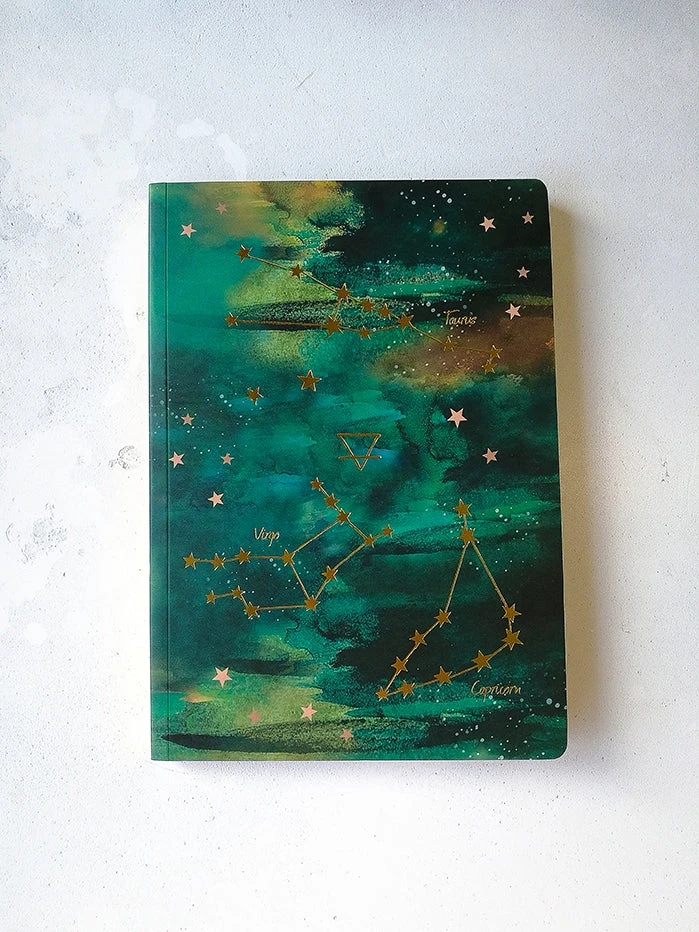 Nikki Strange’s new zodiac inspired collection has the zodiac constellations printed in gold foil. Earth features Taurus, Virgo and Capricorn.Â