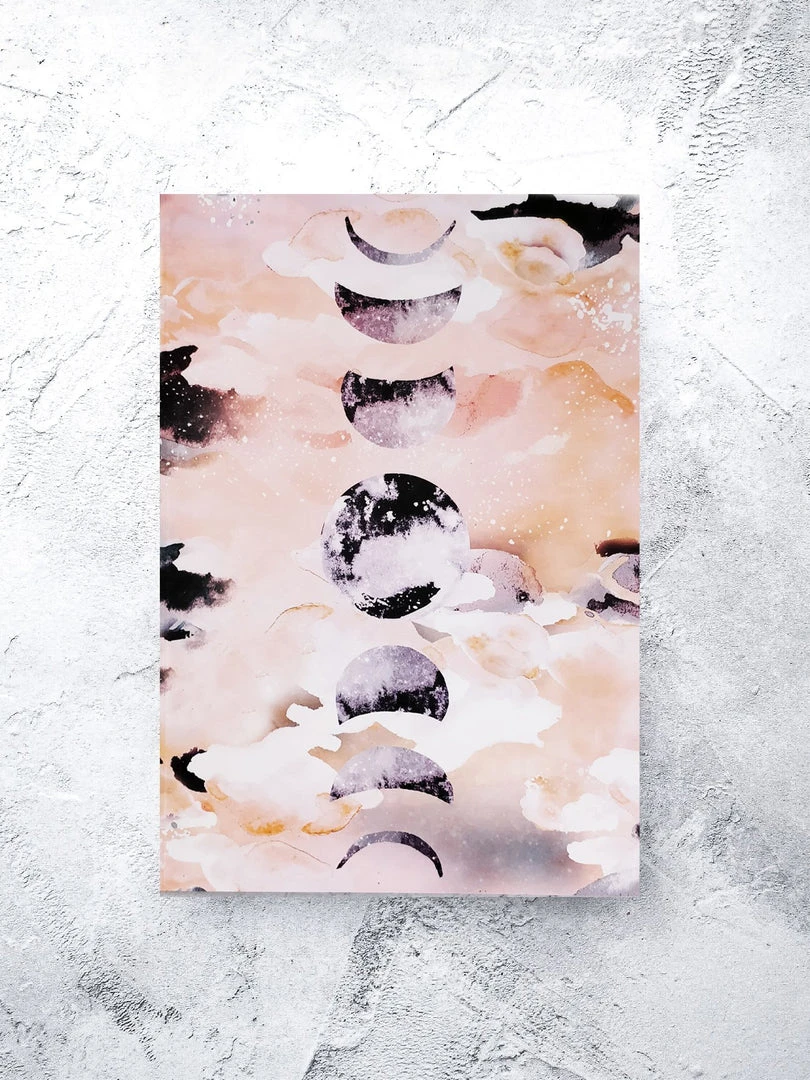 This design features the phases of the moon on a dusty pink and ochre cloudy background.