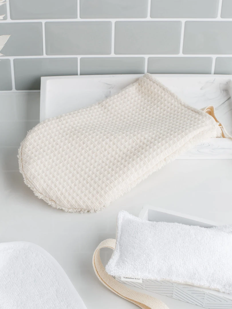 Smoothen your skin with this plastic free, exfoliating shower mitt from Tabitha Eve. An essential addition to any self care, zero waste beauty routine. Ideal for removing dry, dead skin cells and detoxifying your skin by improving blood circulation.