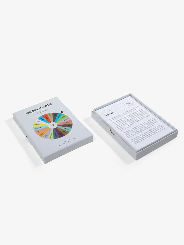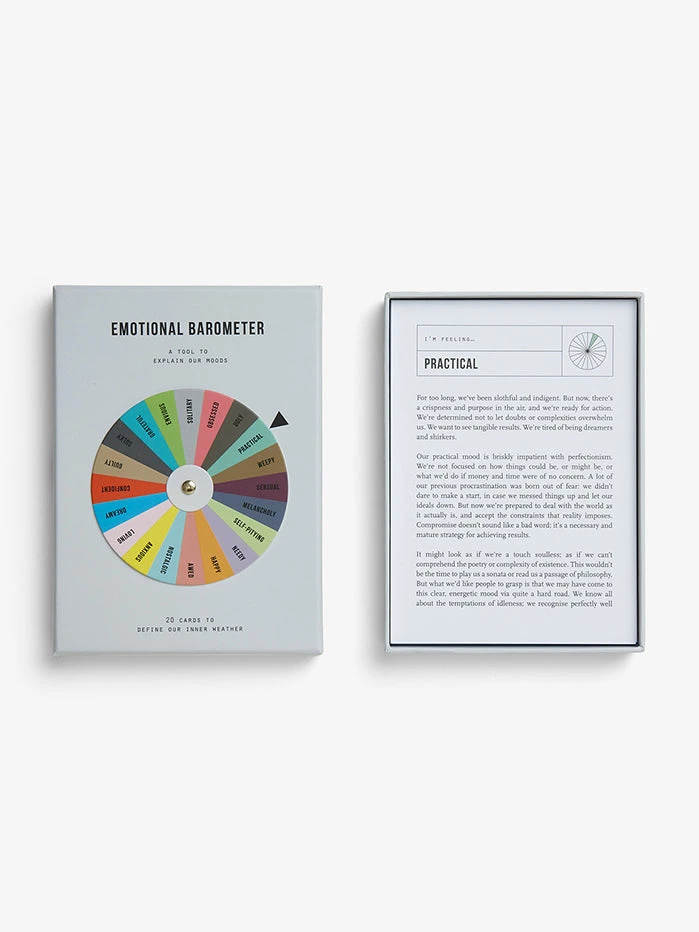 This set of 20 cards with a movable dial on the box.is a tool to help us over our vagueness: cards that crisply, deeply and at points wittily define twenty moods that we can all recognise but that we sometimes have a hard time pinning down and explaining.