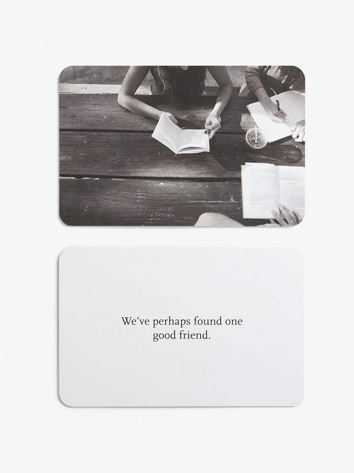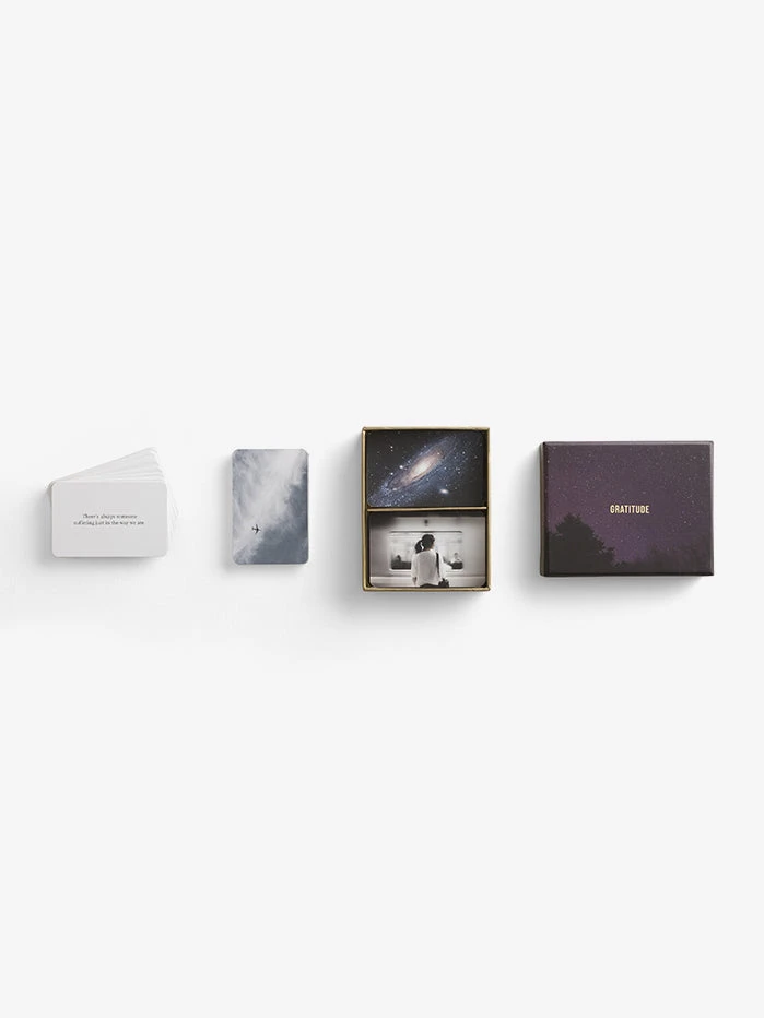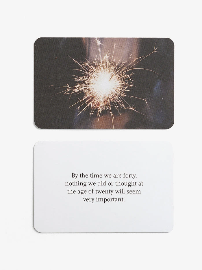 A set of 60 cards to remind us of the many reasons we have to be thankful. We are experts at focusing on what is missing from our lives. Our dissatisfaction often serves us well; it keeps us from complacency and boredom. But we are also dragged down by a pernicious inability to stop, take stock and recognise what isn’t imperfect and appalling. In our haste to secure the future, we omit to notice what is already very good. This pack of cards is designed to help us pause in our striving and, for a few moments, take on board some of what we have to be grateful for – a consoling, inspiring corrective to the lessons in cynicism and sourness that the world teaches every day.