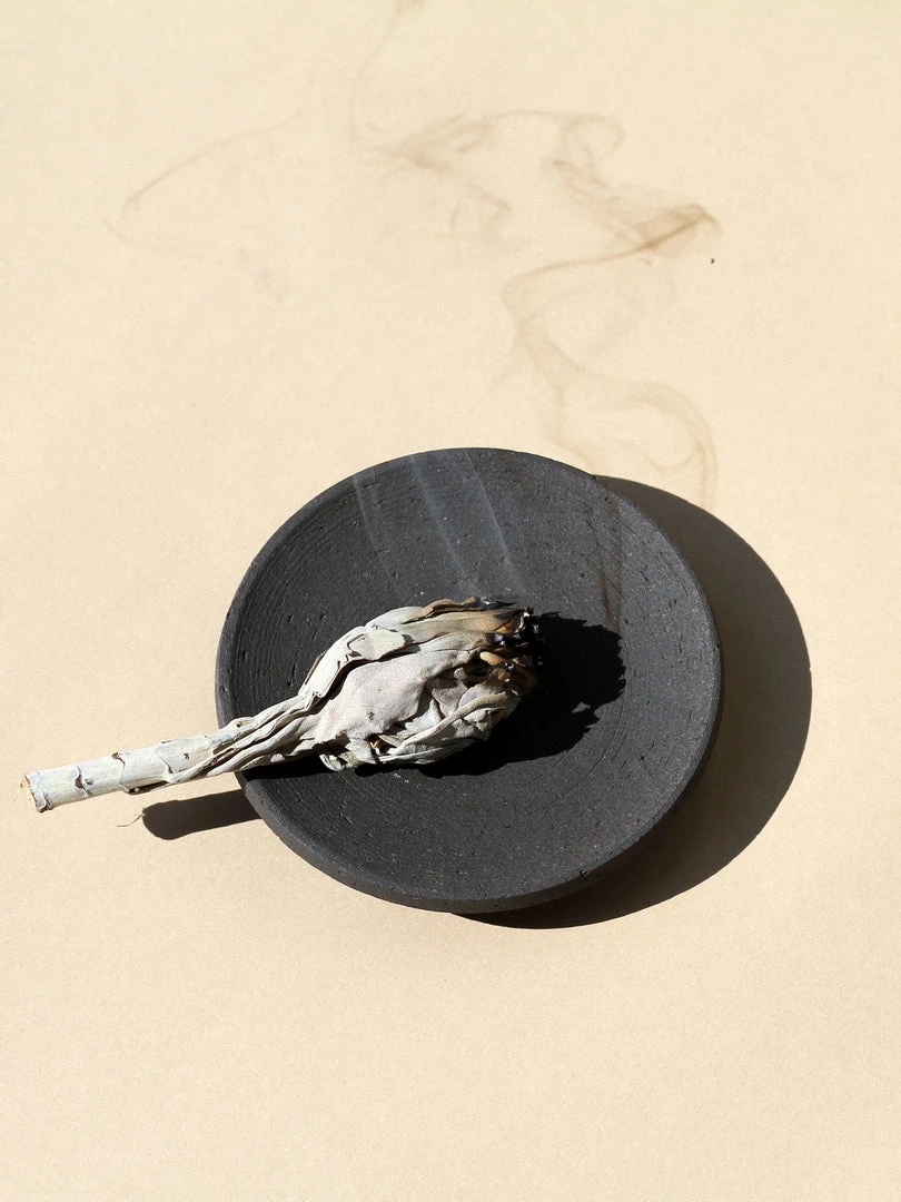 The Ume Collection smudging dish is hand-thrown on the wheel and made in raw black stoneware. This piece is versatile as it can be used for smudging with Palo Santo & Sage, and also comes with a gold metallic incense stick dome holder.