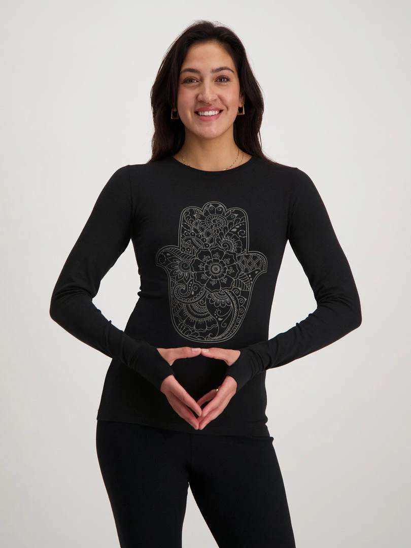 Complete your yoga outfit with this unique Karuna longsleeve yoga shirt with a design of Hamsa Hand symbol. In yoga, it represents the energy flow of the chakras in your body, but also the five senses and the mudras. Each finger on the hand refers to its own chakra and element.