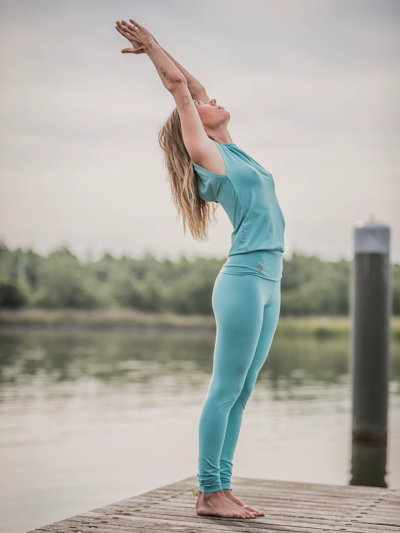 Urban Goddess’ Bhav is a long yoga top made from a sustainable bamboo/organic cotton/lycra blend that you can wear as a yoga tunic as well. This eco-friendly yoga top is extra long and therefore also works well for tall yoginis. The Bhav yoga top features a broad waistband, which is very practical for inversions, so definitely no sliding or bare bellies during your Sarvangasana, and also wonderful if you want your belly to be covered.