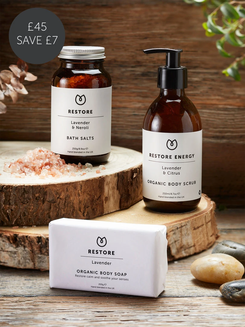 Take some time to indulge with our Yogamatters Restore Bath Set; including our organic bath salts, body scrub and soap bar, in the soothing and refreshing scents of Lavender, Citrus and Neroli.