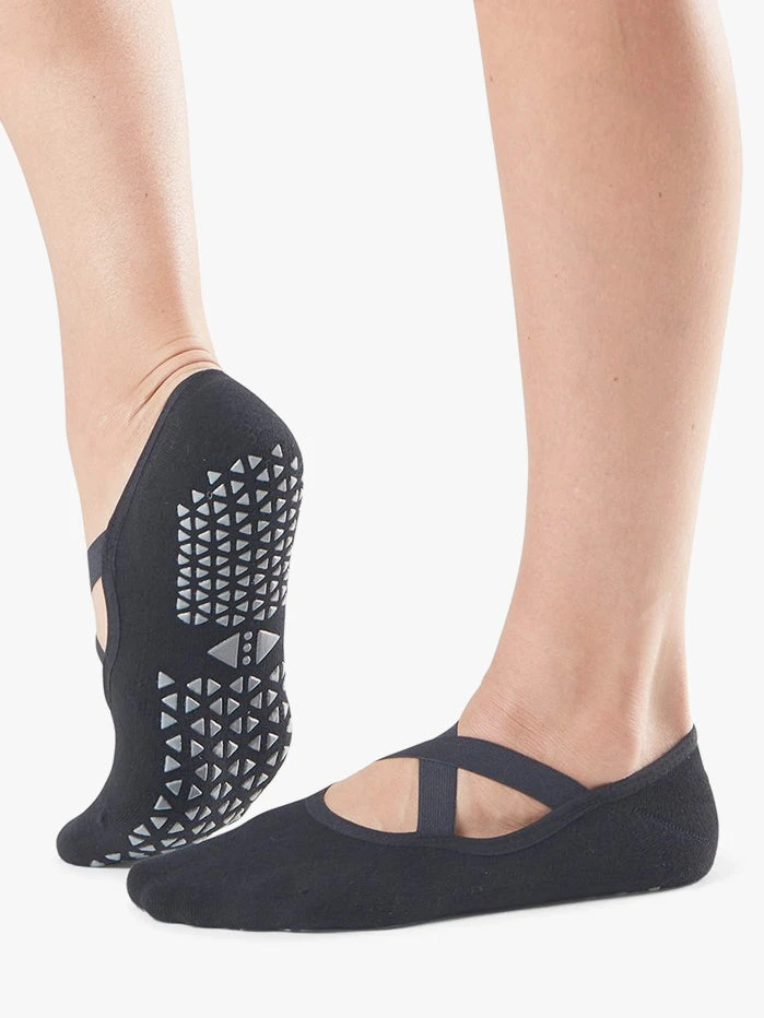 Fall head over heels for Chloe’s sweetly criss cross elastic design. Her low profile hugs just below the ankle while Tavi Noir’s stellar grip sock pattern safely moves you through barre, Pilates and yoga classes. Criss cross elastic detail to keep sock in place.
